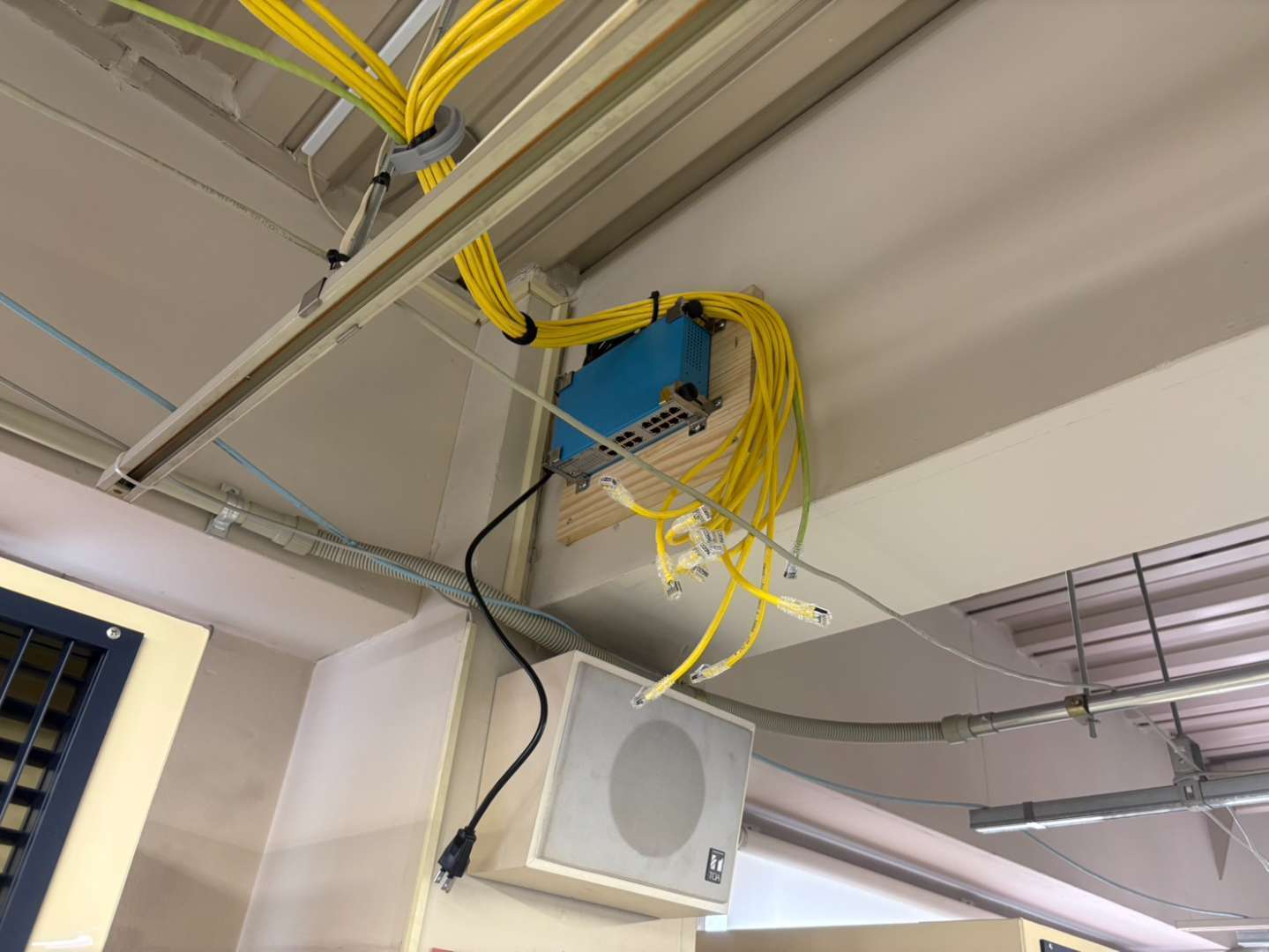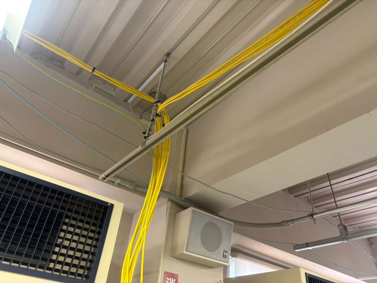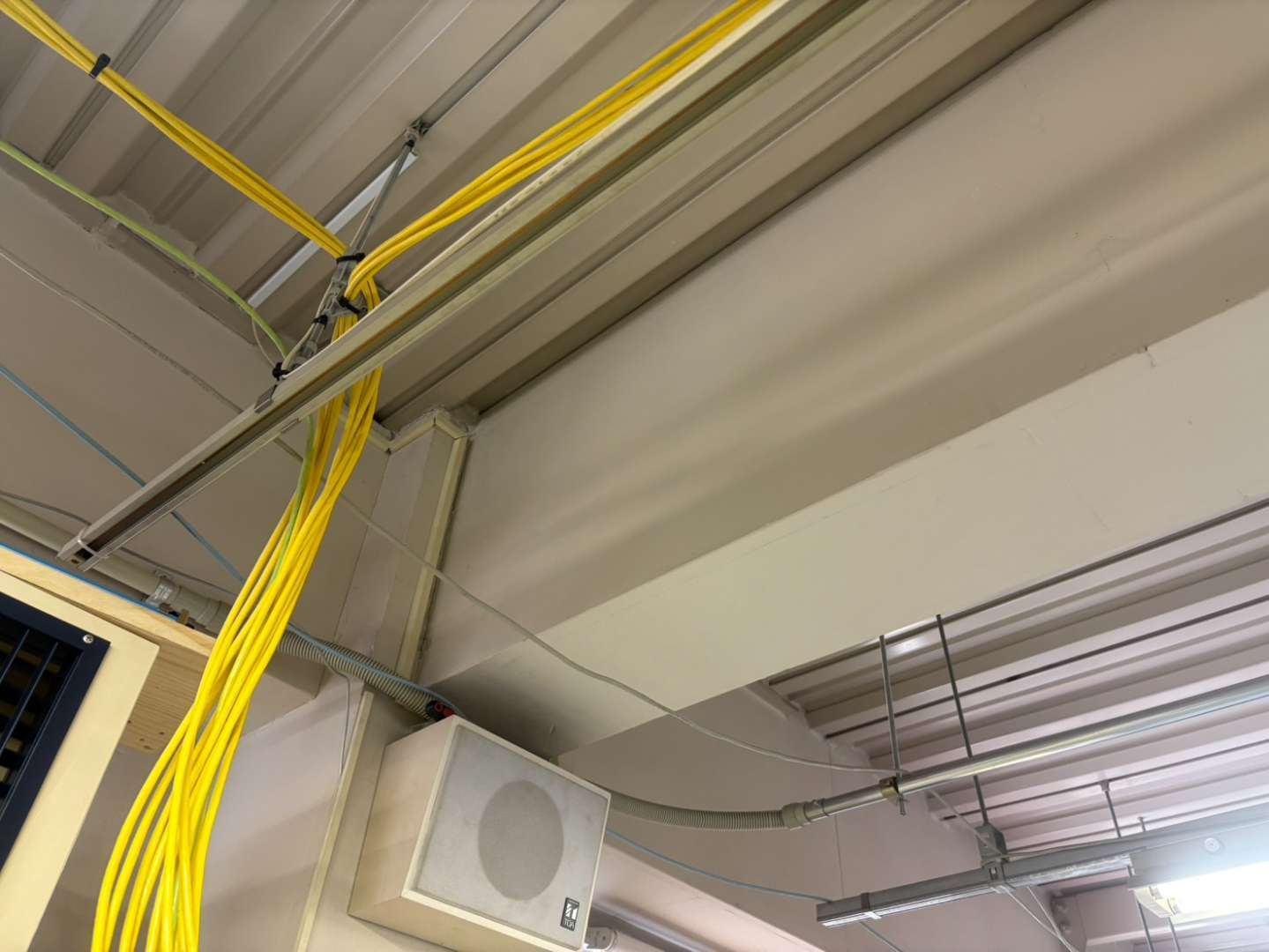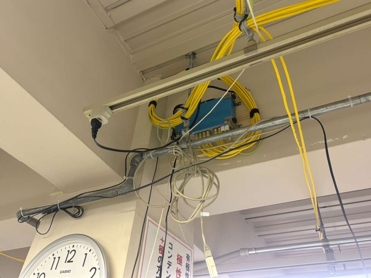 今回はネットワークラックがなく、安全面・美観の観点から床面にケーブルを這わせることが困難な環境でした。そこで、天井の照明設備などを利用して配線ルートを確保し、ケーブルが極力露出しないよう、丁寧な施工を心がけました。