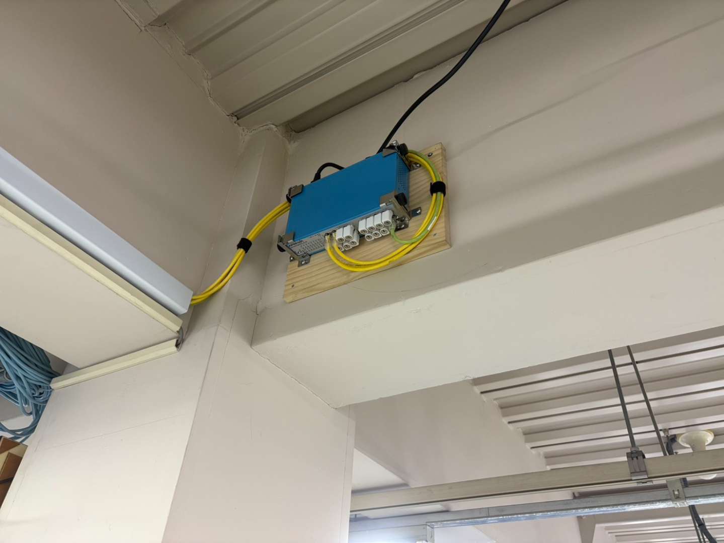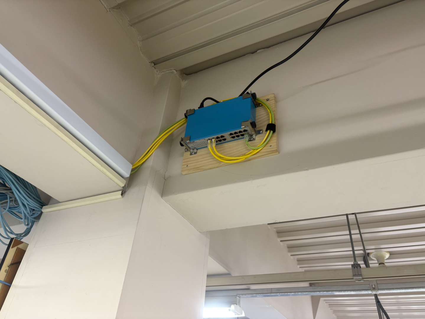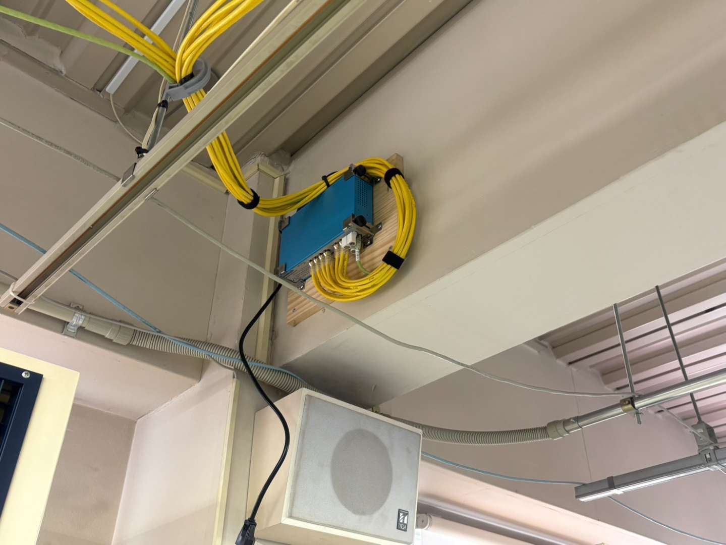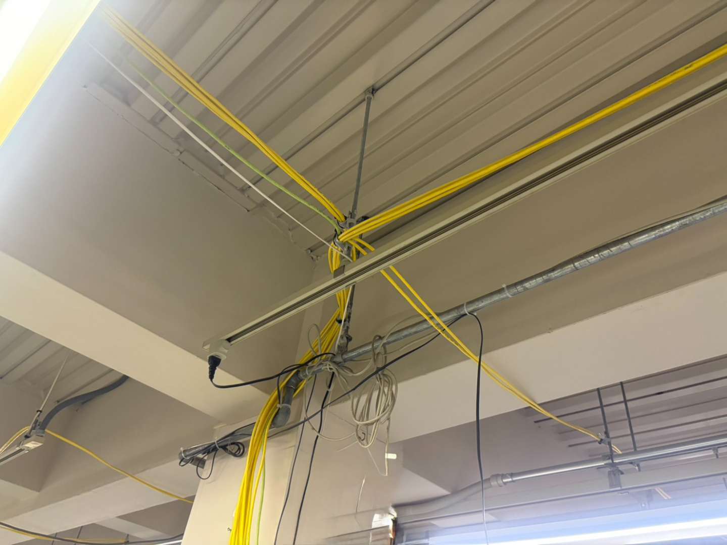 今回はネットワークラックがなく、安全面・美観の観点から床面にケーブルを這わせることが困難な環境でした。そこで、天井の照明設備などを利用して配線ルートを確保し、ケーブルが極力露出しないよう、丁寧な施工を心がけました。